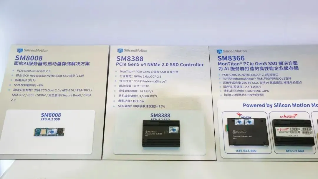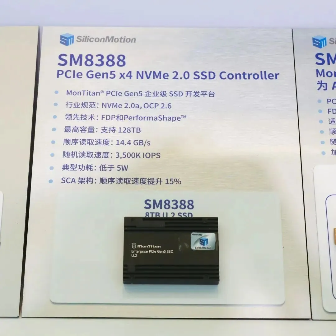 现场演示:展台现场动态演示了搭载SM8388主控芯片并支持SCA技术的U.2 8TB固态硬盘。此外,现场还静态展示了至誉科技(Exascend)、宜鼎国际(Innodisk)、威刚(Adata)等品牌使用SM8366主控芯片所打造的企业级SSD产品,以及搭载SM8008主控芯片的M.2 1TB企业级启动盘SSD。