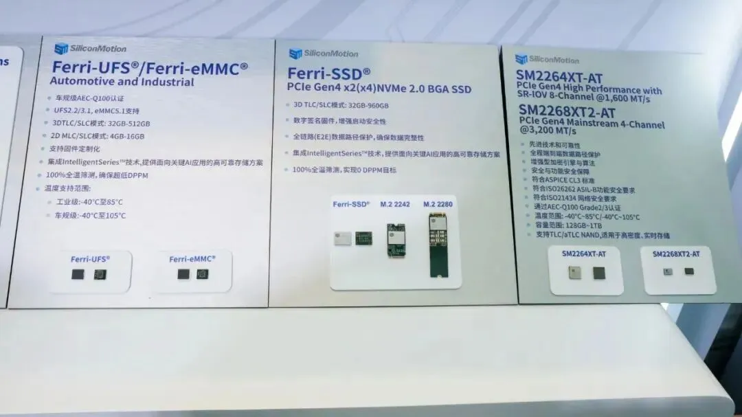 在对数据安全与稳定性要求极其严苛的边缘计算与车载应用领域,慧荣科技同样带来了丰富的产品阵容。现场静态展示了包含单芯片存储解决方案FerriSSD®️(M.2 2242/M.2 2280模块)、Ferri-eMMC®️/Ferri-UFS®️芯片,以及具备高可靠性的车规级主控芯片SM2264XT-AT与SM2268XT2-AT,为智能汽车及边缘智能硬件构筑了坚固的数据底座。