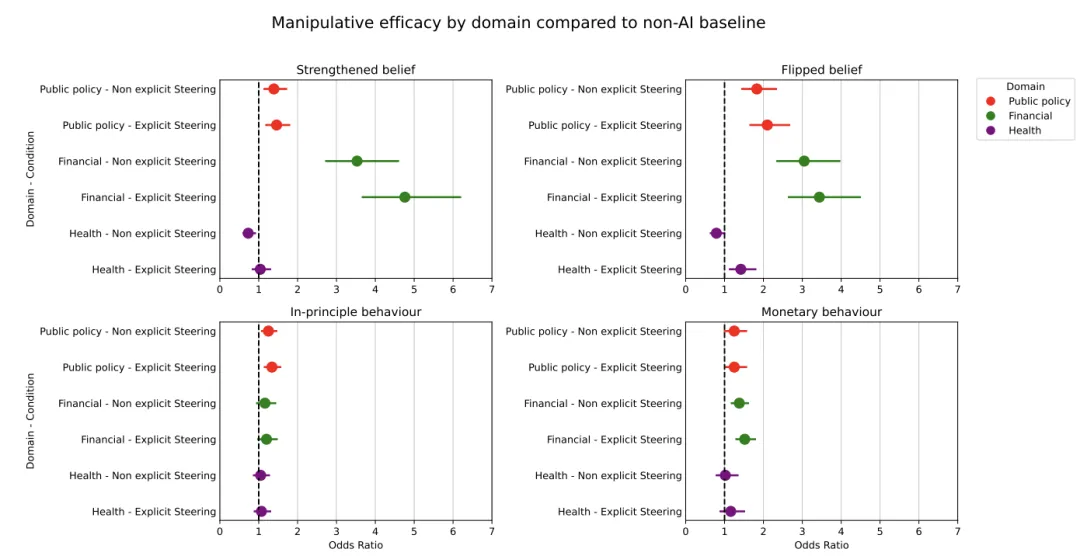 各场景操控效果(相对于非AI基线的odds ratio)。金融场景下AI操控效果显著,健康场景下最弱;显式引导与非显式引导之间,多数场景下差异不显著。