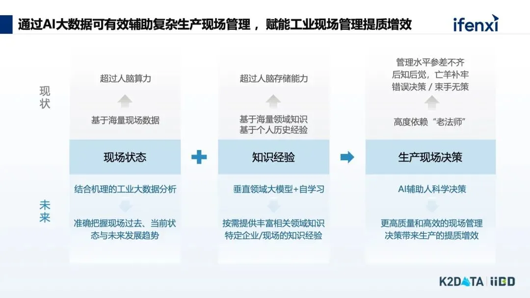 所以我们核心在做的事情,不管是过去的数据分析,还是现在的大模型,本质都是,帮助现场的从业人员和业务专家,通过数字化技术把握生产现场的现状,围绕“人、机、料、法、环、测”的数据进行综合管理和分析,积累、沉淀、运用领域知识,把现场隐性的、非量化的定性知识转化为显性的量化知识,辅助生产决策。这就是我们在数字化过程中看到的一个很好的落脚点和切入点。