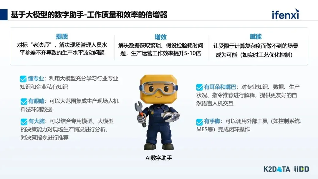 运用大模型、传统机理模型、数据分析模型,去勾勒和沉淀工业知识,并将其外化、泛化为各种各样的工业助理,帮助我们执行工作。
