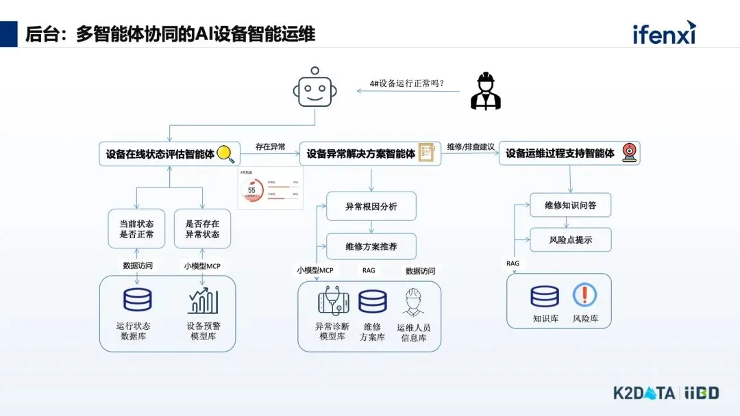 比如,要判断设备是否正常,首先需要一个在线状态评估智能体,实时盯着设备运行状况,结合知识库判断异常类型。有了初步判断后,还需要定位根因、给出解决方案,这就要用到异常解决方案智能体。维修过程中,还需要维修过程支持,包括风险点提示等。维修完成后,还要把运维经验沉淀下来,迭代回知识库,成为未来的设备运维知识。
