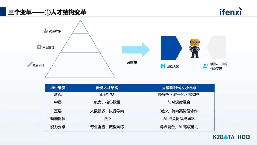 过去很多工业企业是金字塔式的管理,高层、中层、基层。现在有了大模型等新技术,大家常讨论人才结构会变成“松树型”,意思可能是基层人数减少。但我不太想从减员的角度去谈,更愿意从能力结构的变化来看。