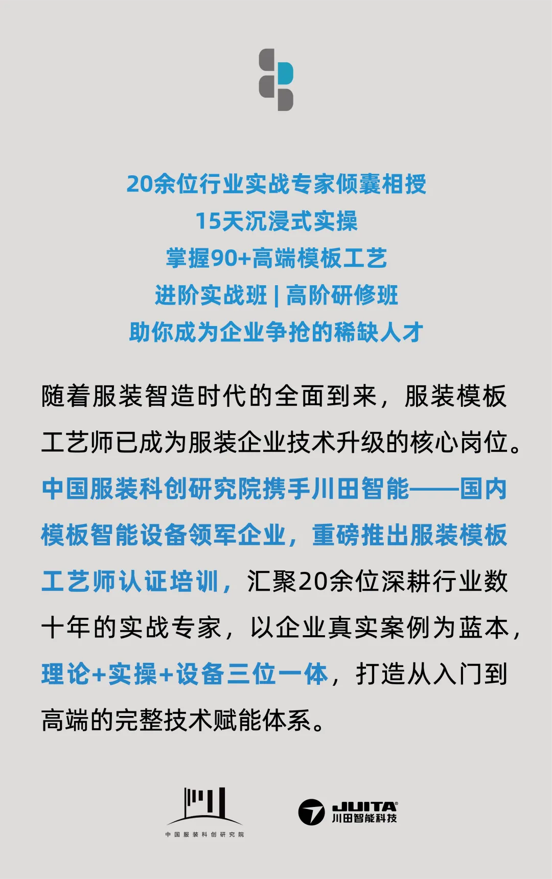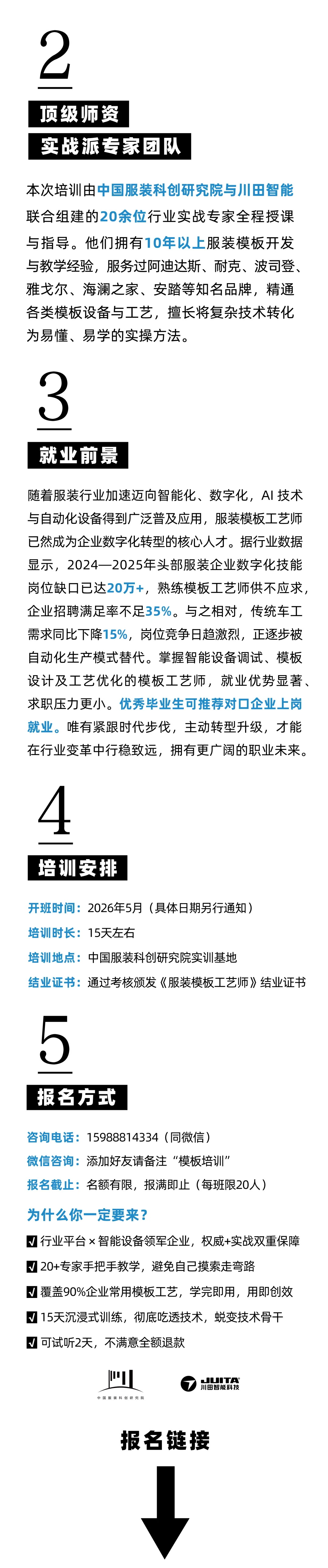 特别关注|服装模板工艺师专业培训报名火热进行中服装模版工艺师培训现场画面模板工艺培训进阶实战班课程.docx模板工艺培训高阶研修班课程.docx编辑:纪振宇初审:纪振宇复审:齐元勋终审:刘晓青精彩推荐电子会刊 | 中国服装协会电子会刊 第1期官宣!2026中国服装协会女装产业创新发展大会演讲嘉宾阵容+日程全公布2026中国服装协会职业工装供应链大会日程安排关于举办2026年全国行业职业技能竞赛——全国纺织行业裁剪服装制版师职业技能竞赛的通知大湾区(国际)服装及时尚生活展览会观众报名通道开启!串联生活场景,直击采购需求!