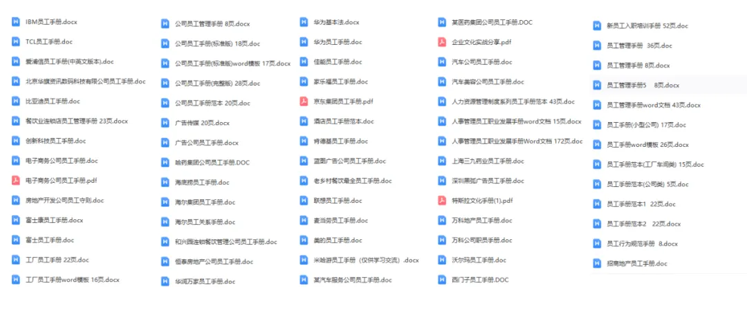 《员工管理手册模板资料包》,共74份资料,包含员工手册模板PPT、大厂员工手册参考、员工手册标准模板文档等等。部分资料展示如下: