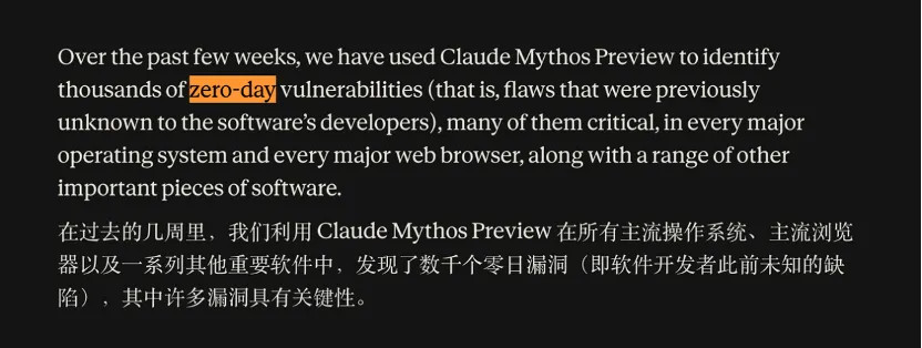 Anthropic在博客里公布了一组数字,Mythos Preview在测试期间,对主流操作系统和浏览器做了一轮安全扫描——自主发现了数千个高危零日漏洞。