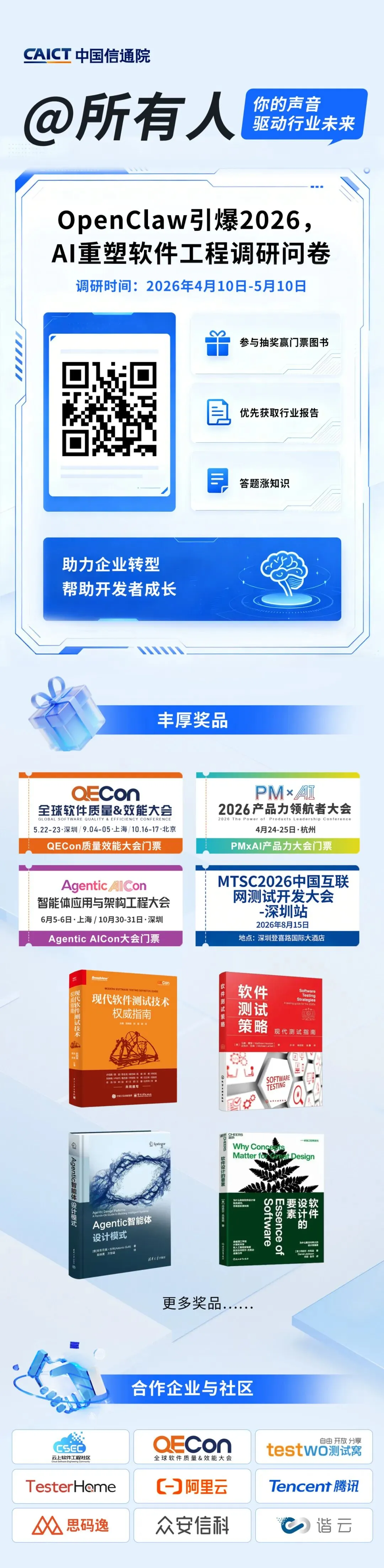 2026年,以OpenClaw为代表的技术创新引爆AI开发浪潮,AI正以超越想象的速度重塑软件工程。从单点工具到Agent工程化、多智能体协同、AI原生开发,一场深刻的产业变革已然到来。为系统梳理当前AI+软件工程的产业实践现状,中国信通院现联合云上软件工程社区、TesterHome社区、QECon组委会、测试窝社区、阿里云、腾讯、思码逸、众安信科、谐云科技等产学研机构,共同发起2026年“AI重塑软件工程”调研。本次调研以问卷形式开展,将延续前序研究的权威性行业调研框架,重点关注组织治理、技术演进、落地实践与产业未来生态建设等核心维度,全方位还原行业真实实践图景。
