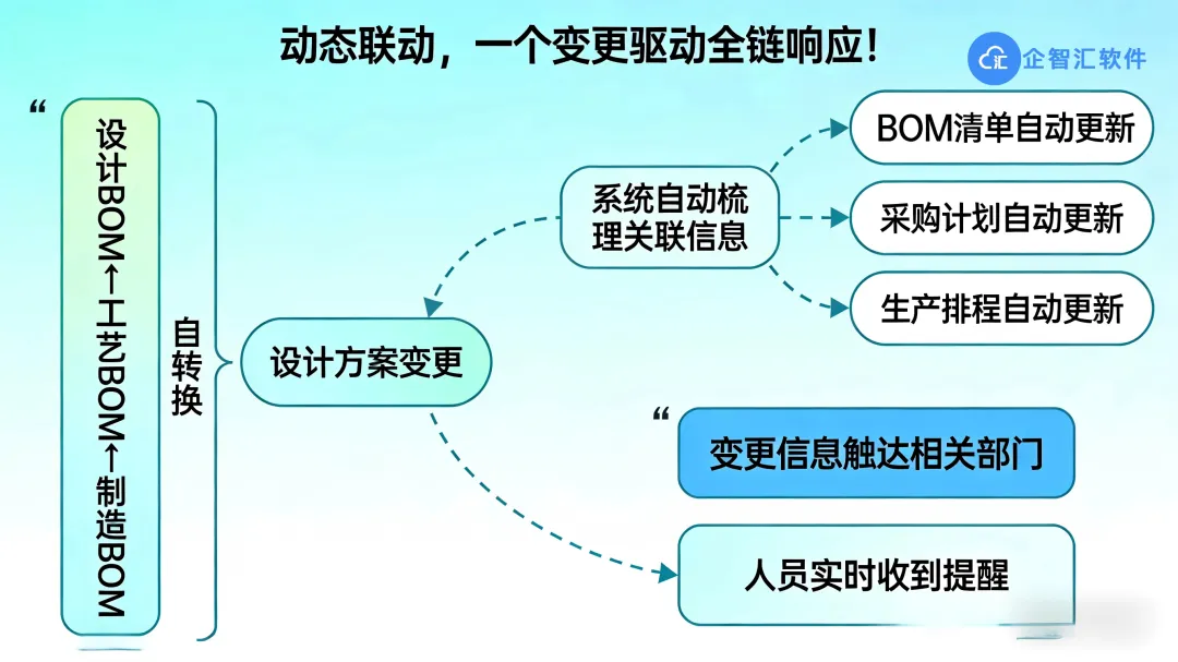 企智汇最硬核的能力在于“牵一发而动全身”的实时联动。 当设计方案发生变更,系统立即自动梳理与该变更相关的所有关联信息——BOM清单、采购计划、生产排程全链路自动更新。系统支持从设计BOM向工艺BOM及制造BOM的自动转换,确保生产部门拿到的永远是最新、经审批的正确版本。