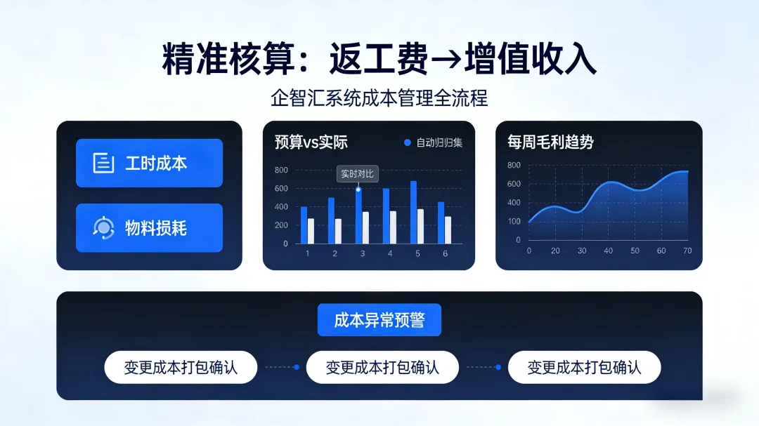 每次变更,企智汇系统都将工时成本、物料损耗自动归集,实时对比预算vs实际,每周呈现毛利趋势,让成本异常无所遁形。