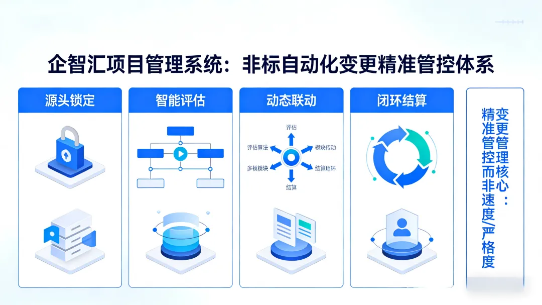 针对非标自动化“改不停”的顽疾,企智汇项目管理系统提供了“锁源 - 控变 - 联动 - 闭环”四步走方案,让每一次变更都可管、可控、可追溯,从根本上守住项目工期与利润红线。