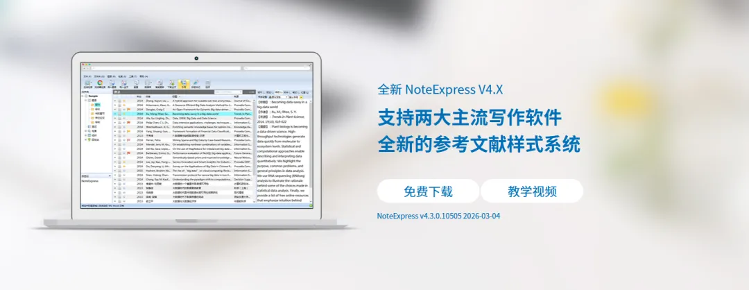 NoteExpress是目前国内应用较广泛的专业文献检索与管理系统,完全支持中文,丰富的管理功能便于对数以千计的电子文献进行管理,按照不同的研究方向分门别类,按照年份、作者、标题等排序,可以量化分析检索结果、发现科学问题、规范写作和提高效率。
