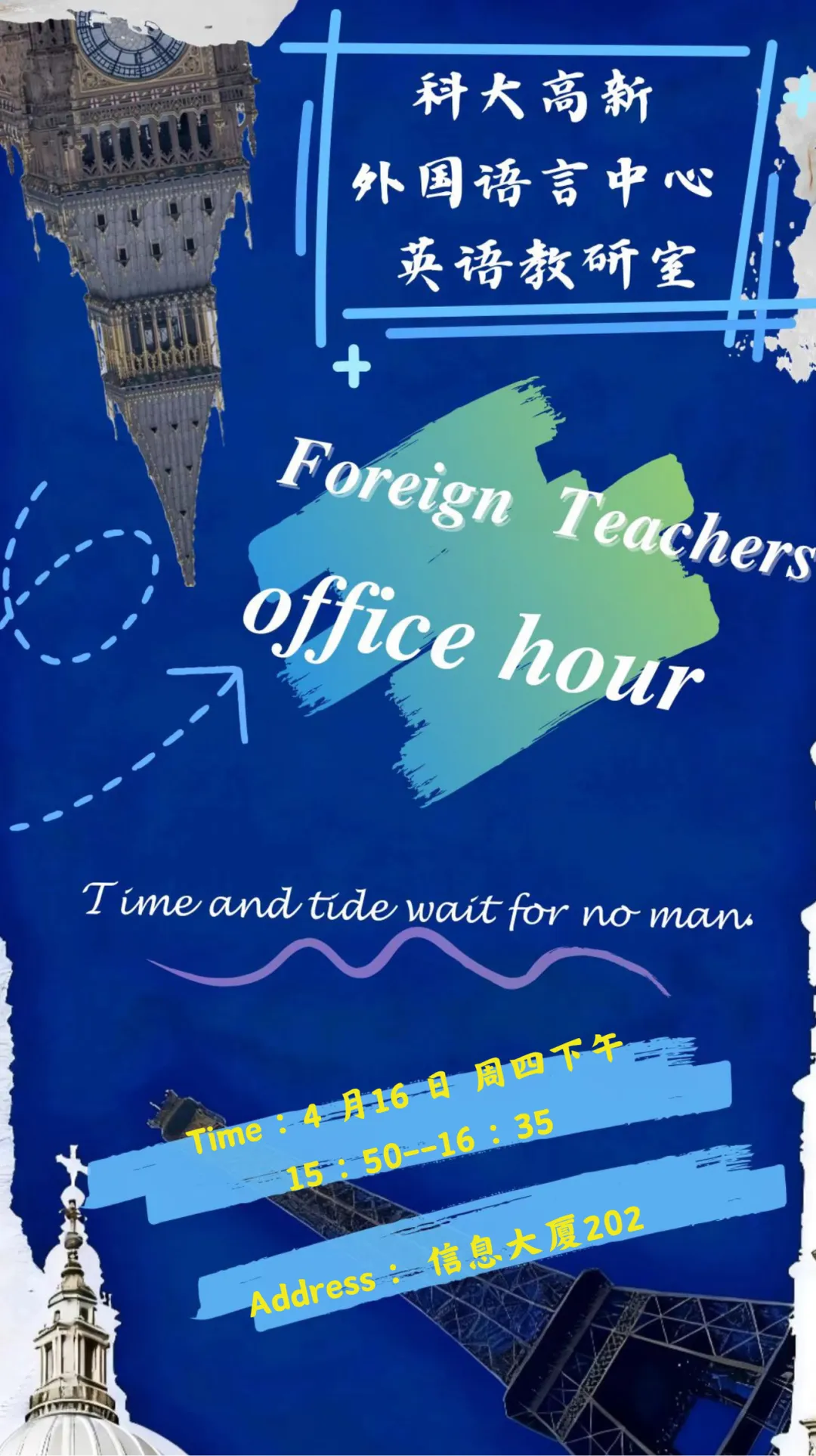 科大高新外国语言中心英语教研室外教Office Hour4月16日等你来嗨!热爱英语的小伙伴看过来!👉4月16日周四下午15:50-16:35💡信息大厦202科大高新外国语言中心英语教研室外教Office Hour等你来嗨🚀🚀,一起开启妙趣英语交流派对,别错过哦~👏👏👏