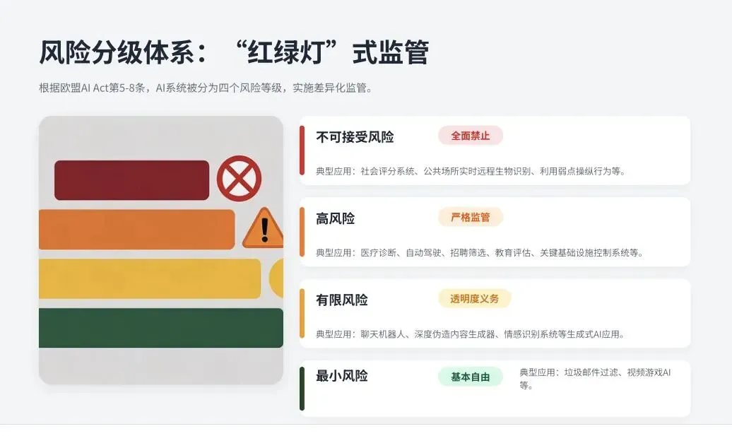 1.1 风险分级体系根据欧盟AI Act第5条-第8条规定,将AI系统分为四个风险等级,实施"红绿灯"式监管: