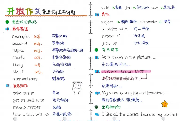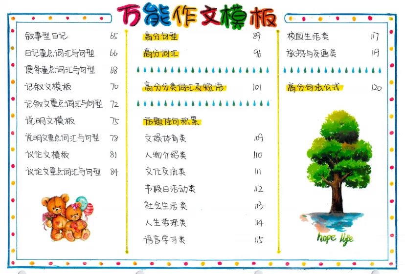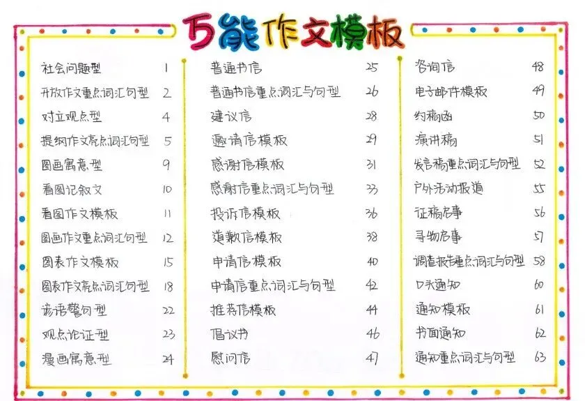 130页手绘英语万能作文模板,让孩子轻松写出优秀考场作文!今天给大家分享一套手绘英语万能作文模板。英语老师都推荐的绝佳资料,包含所有英语考试作文类型,只需背下模版,套套词汇,即成一篇优秀文章。如果说孩子临考时间紧,实在挤不出时间复习提升了,那就看看这份万能作文模板吧!笔记中整理的介词、动词、短语固定搭配,对于选择题、填空题、阅读理解、作文都有非常好的提分作用,帮助我们更快记忆知识点!这是一套能让你至少写出东西的模板,但是如果想在此基础上更上一层楼,让框架内容更丰富更全,一定一定要动手去写。作文这个东西,不自己动手去写,是一定不会有进步的。130页高清全彩PDF已准备好了,赶紧打印让孩子练起来吧~领取方式如下第一步:识别下方二维码关注公众号第二步:在对话框回复“作文模板”参与领取