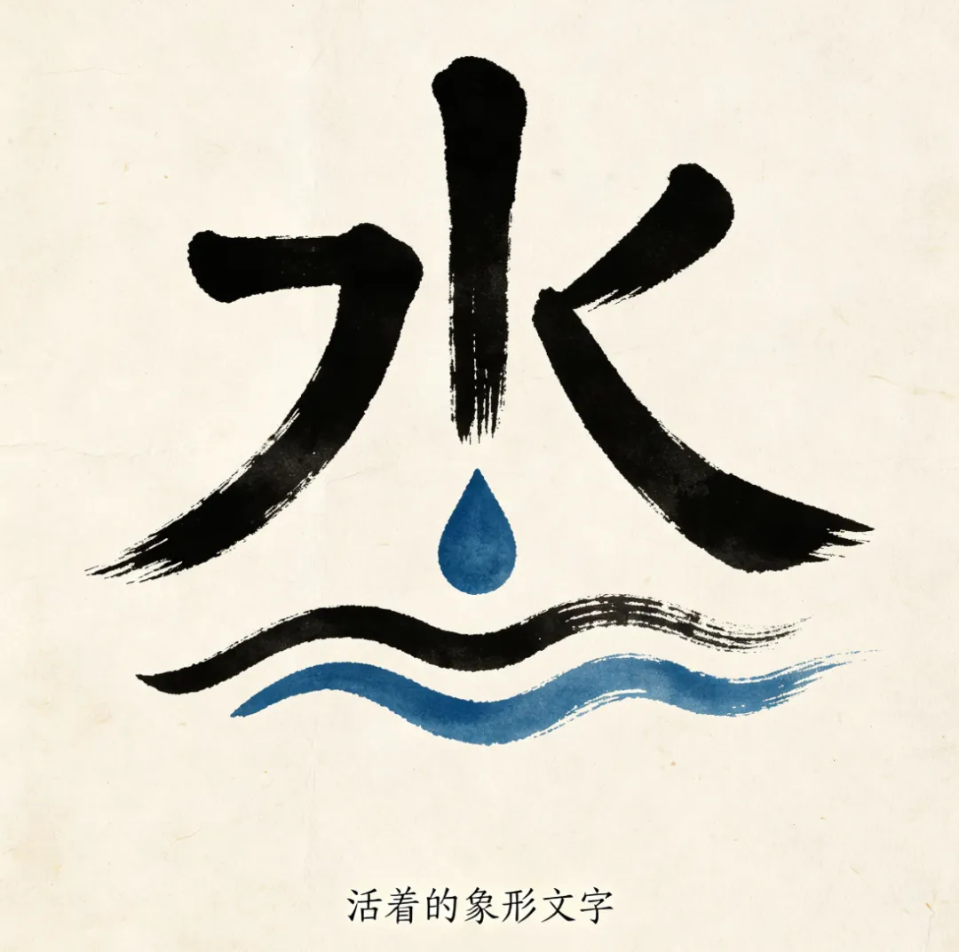 AI把"水"理解成了毛笔书法的水,而不是东巴文那种"画几滴水"的原始感觉。