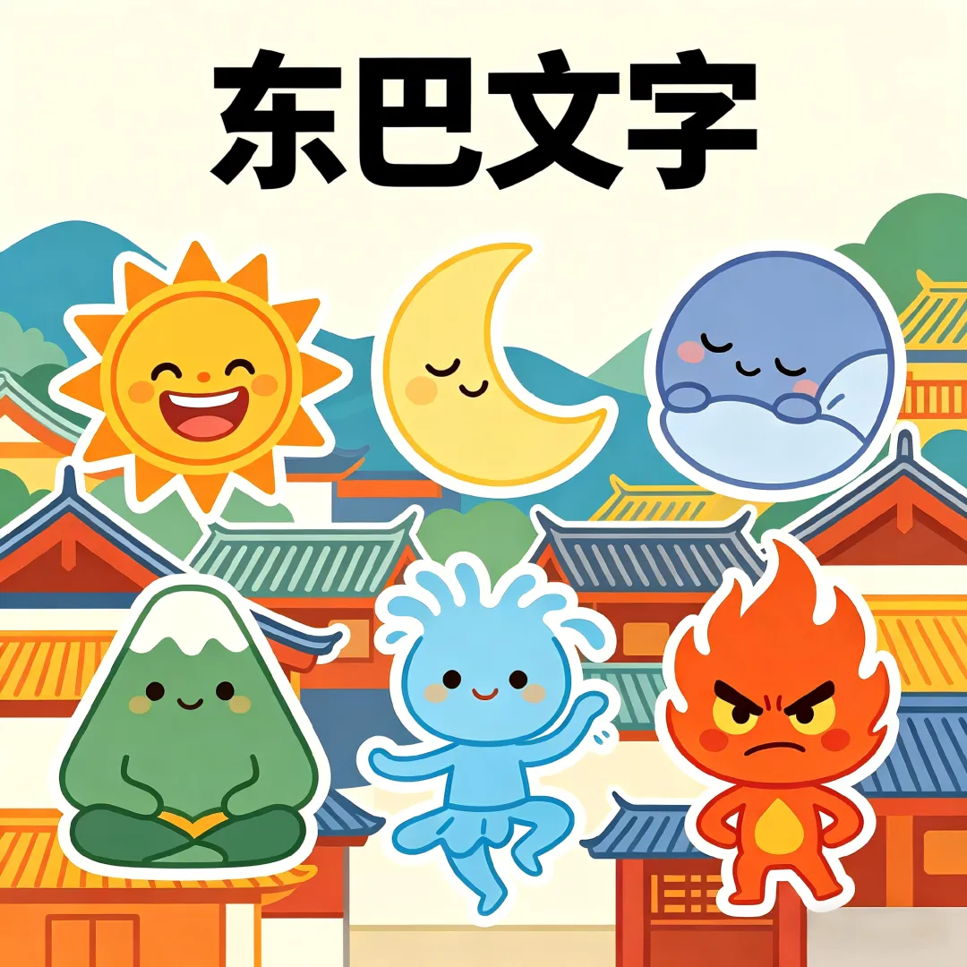 比例1:1,潮流插画海报,纳西族东巴文字元素,将东巴象形文字"日、月、山、水、火"五个字设计成五个可爱的卡通角色,每个字有表情和动作,太阳在笑,月亮在睡觉,山在打坐,水在跳舞,火在发怒,背景是丽江古城的屋顶轮廓线,风格参考:奈良美智+扁平化设计,色彩明亮,标题文字"东巴文字"用粗结果: 这版反而意外地好!
