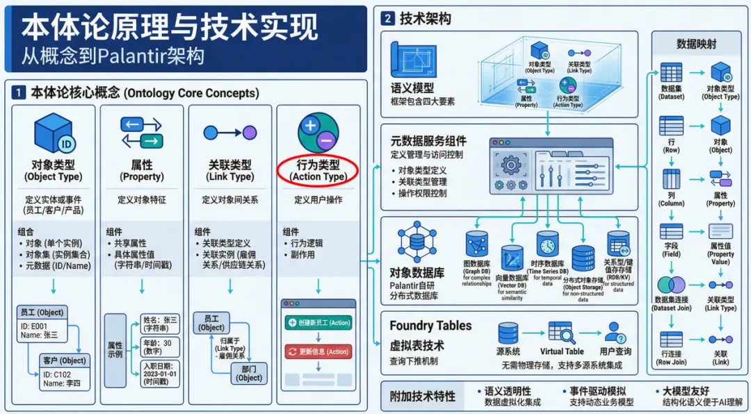 本体增强的AI:旧瓶新酒?空中楼阁?画蛇添足?以Palantir为代表的Foundry+AIP打法,为AI在B端的落地,示范了一套新的模式,我们姑且称之为“本体增强的AI”模式。当然,对这种打法,也有一些不同的声音。一种是复古派。他们看见本体,就想到了知识图谱,看到了知识图谱,就想到了实体关系网络乃至传统数据建模的E-R图。于是乎,结论自然是“古已有之,旧瓶新酒”,没啥新东西。一种是怀疑派。他们认为,没有全面的数据治理,数据的一致性、准确性和数据血缘的追溯就没有全面的保证,建立在这样不牢靠基础上的本体,犹如空中楼阁,不足以为B端AI落地所用。还有一种是实战派。他们认为,本体是不必要的,纯属“画蛇添足”。没有本体,Agent照样可以直接建立在业务系统、业务数据要素的调用接口之上,无需通过本体这个层次作为中间人“赚差价”。事情真的是这样吗?今天我们就来解读一下,Foundry+AIP打法到底是什么,它跟传统知识图谱是什么关系,跟数据建模是什么关系,跟数据治理又是什么关系。在AI时代,Foundry+AIP打法对于B端的AI落地,意义到底是什么。Foundry的本体观是把从业务视角抽象出来的顶层视图拆解为四大基础范畴:对象类型(Object Type)、属性(Property)、关联类型(Link Type)、和行为类型(Action Type)。前三种范畴,在知识图谱和数据建模的传统讲法里都有,但动作对于知识图谱而言并不是“古已有之”的。最接近动作概念的,是“事件”。在其中,面向实例的事件知识库和事件的抽取、关联、预测等工作更是占据了主流。很多研究都是把事件当作另外一种“时序性、带论元的实体”来对待的,只是操作执行的痕迹,并不是操作执行的潜在或现实能力,更没有真正触达事件的“可执行、可编程”的本质。将事件连同其本体纳入知识图谱的研究,其历史也就不到10年。把事件的执行效果反过来体现在实体、关系、属性的变化上,是笔者近10年来在“事理图谱/可编程本体”研究和实践中一直不断强调的重点,可惜真正听懂的人不多。一直到Foundry打法的浮出水面,才终于在这里找到了知音。真正留给面向本体的事件/事理图谱研究成果,本来占比就不高,更遑论在企业级的规模上将事件本体以“回写”的方式,与企业内部的可执行组件实例进行对接的案例了。至于E-R图和传统数据建模,其表达能力本就在传统知识图谱的范围之内,更不值得单独拿出来跟事理图谱比较了。所以不管动作也好,事件也好,指的都是“可编程的本体”。可编程,关键是一个“可”字,原生的也好,挂上去的也好,必须容许可执行成分的存在,并且执行的效果相当于回写到实体、关系、属性,并可以从本体层被观测到。这绝不是在传统知识图谱甚至在“事理图谱”的旗号下主流所做的事情,更与在企业落地的传统知识图谱项目没有半毛钱关系。忽略了这个重大差异,谈什么古已有之,新瓶旧酒,其实是没有读懂本体在企业落地的最核心的技术范式变化。