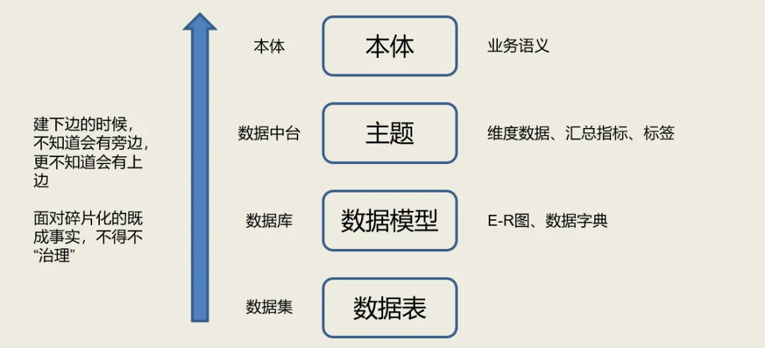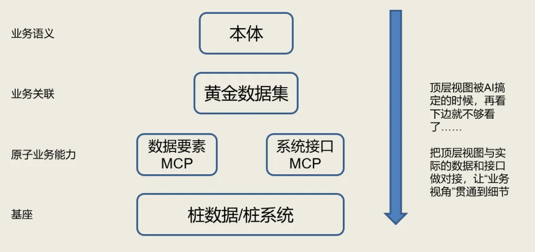 观察Palantir的技术架构,可以发现他们并不试图全面治理企业的全部数据,而是根据企业需求形成具体的任务,通过任务的驱动来倒推完成这个任务所需要的黄金数据集是什么,进而实现边治理边挂接。纵使他们已经有了一张企业级本体的蓝图,在具体的实施中也绝非把蓝图一股脑儿塞给客户,而是极为冷静地截取任务所需部分来做这件事。说得极端一点儿,哪怕你的数据在我实施的任务触达不到的地方烂成一锅粥,我也懒得去跨越任务的边界去做点什么。只要你的数据在我实施的任务可以触达的地方达到了黄金数据集的一致性、准确性和数据血缘的质量要求,就一切OK。这看起来非常不合常理,甚至有违所谓的“专业良心”。明明看到了有那么多的数据治理欠债,却仅仅治理自己任务可触达的那“一亩三分地”。这是不是太冷酷了?其实这恰恰是对数据治理的一种自顶向下的最实际的切入方式。多少大而全的数据治理项目,因为没有实际任务的牵引,一头栽进了深不见底的大坑而不自知。凡是成功的数据治理项目,一定是有所不为的,一定是以一批核心任务为驱动,以核心任务的闭环为标准进行了筛选的。离开了核心任务的牵引,数据治理就失去了方向,多少无用功就浪费在了这个深不见底的大坑里。相较于自底向上的技术路线,自顶向下的技术路线是数据治理更加符合实际也与AI原生能力更加匹配的切入方式。首先,不同的系统/数据模型建成的年代差异很大,建成时大概率彼此并不知晓知道对方的精准存在,更不知道多少年以后的数据基础设施(例如企业级数据仓库、数据中台)长什么模样,更不知道多少年以后基于AI原生能力的任务需求长什么样。所以,不可以站在上帝视角苛求前人。自底向上的切入方式,恰恰相当于带着上帝视角来改造当年的数据模型。这是不现实的,也是不必要的。反观自顶向下的切入模式,它承认存在的都是合理的,无需对之前的数据模型进行理想化的、一刀切的改造或者“再造”,只需要在任务可触达的地方进行有限的“适配”,提炼出“黄金数据集”了事。可以说,“黄金数据集”就是企业数据的“AI特区/AI根据地”,意味着这个地方是跟AI拉齐、跟业务拉齐的,是AI可以踩上去的结实的数据底座;除此以外的地方,我无法保证,当然传统怎么搞还可以继续搞。但是,今后的AI应用特别是AI原生应用,应该是在任务驱动下,从这个“AI特区/AI根据地”逐渐扩展出去的,而不是从一开始就建设一个大而全的AI数据底座。这是大的原则。从这里看,任务驱动的本体建设,不仅不是“空中楼阁”,反而是在任务的驱动下,精选合适的部位搭建的基础最牢靠的数据基础设施。从反面的角度看,考虑到AI原生能力本身也在快速迭代之中,处在发展早期的一个时间片段中,就要去规划今后长久使用的大而全的AI数据底座,也是过于自不量力了。不可否认,自从AI原生能力以Manus的推出为标志有了飞速的提升以来,很多B端企业都在进行各种尝试,面向B端的行业应用软件提供者们也在进行各种尝试,目标就是打造由AI原生能力支持的、面向业务的Agent。但是,这两类主体的尝试,有着不同的动力。从B端企业的业务视角看,AI原生能力的普惠化,以及AI中台最核心的Harness Engineering直接被AI通用技术提供者接管,使得强交互、强展现、强流程性质的需求实现的最佳方式从低码让位给了无码。“个性化定制”这项工作从依赖外包变成了依赖自研,从依赖IT部门变成了业务部门和只有业务背景而无IT背景的人们有条件自力更生了,这样的变化,尽管是尝试性质的,却是关系到主体的重大变化。对接口治理欠债很多的B端企业来说,出现了AI倒逼接口治理、skills和原子能力接口一对一的情况。的确,从单一任务驱动的角度,以及从业务一线的聚焦关注来说,这样是最经济的:既不用去操心架构性质的规划和共享,也不用去操心其他业务单元使用什么后台资源。当然,真这样做了,自然也就没有建立本体的必要了。岂止是本体,整个IT部门的活儿也会大大缩水。但是,这样做的代价就是新时代的新烟囱又要林立了。从B端企业的架构视角看,尽管AI中台的主要功能都是由通用AI技术实现的,但系统和数据的业务抽象,是无论如何也没有办法交给通用AI技术的。系统和数据的使用的语言是技术语言,业务和AI原生使用的语言是业务语言。这中间差着一座连接二者、沟通二者的巴别塔。维特根斯坦说:我的语言的边界就是我的世界的边界。没有巴别塔,业务的语言和技术的语言就分别界定了两个不同的世界。而这个巴别塔,就是本体。本体可以做到自顶向下定义业务语义,直到把它们落到所谓“黄金数据集”上。黄金数据集是经过治理的、向上可以支撑业务语义、向下可以坐实数据和接口资源源头的标准数据集。一开始它可以是任务驱动的小片根据地,但随着任务的增多,根据地不断创建、发展、扩大、整合,会逐渐接管对业务语义的“解释权”。未经本体解释的业务语言,落到实处时就难免会就事论事,歧义丛生。所以,仅仅看离了本体,原生AI的落地还“能不能做”,那实战派的回答是对的,能做。但是,这样做可能产生你不愿意看到的后果。借助于本体,就可以更有章法地去做,更少不良后果地去做,更高效率地去做。在这个意义上,本体这个环节不是“画蛇添足”,而是“定海神针”。语言学上讲,任何字