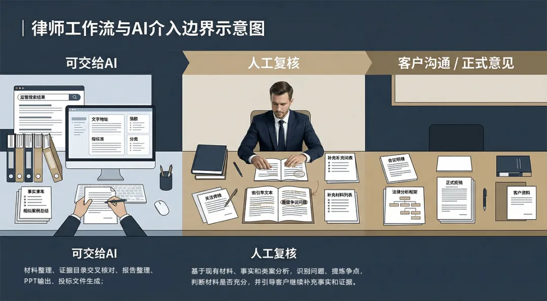 律师工作流与AI介入边界示意图