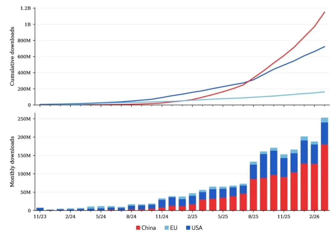 更绝的是,仅 2026 年 2 月一个月,Qwen 的下载量就达到 1.536 亿次——这个数字超过了 Meta、DeepSeek、OpenAI、Mistral、Nvidia、智谱 AI、月之暗面和 MiniMax 这 8 家加起来的总和。