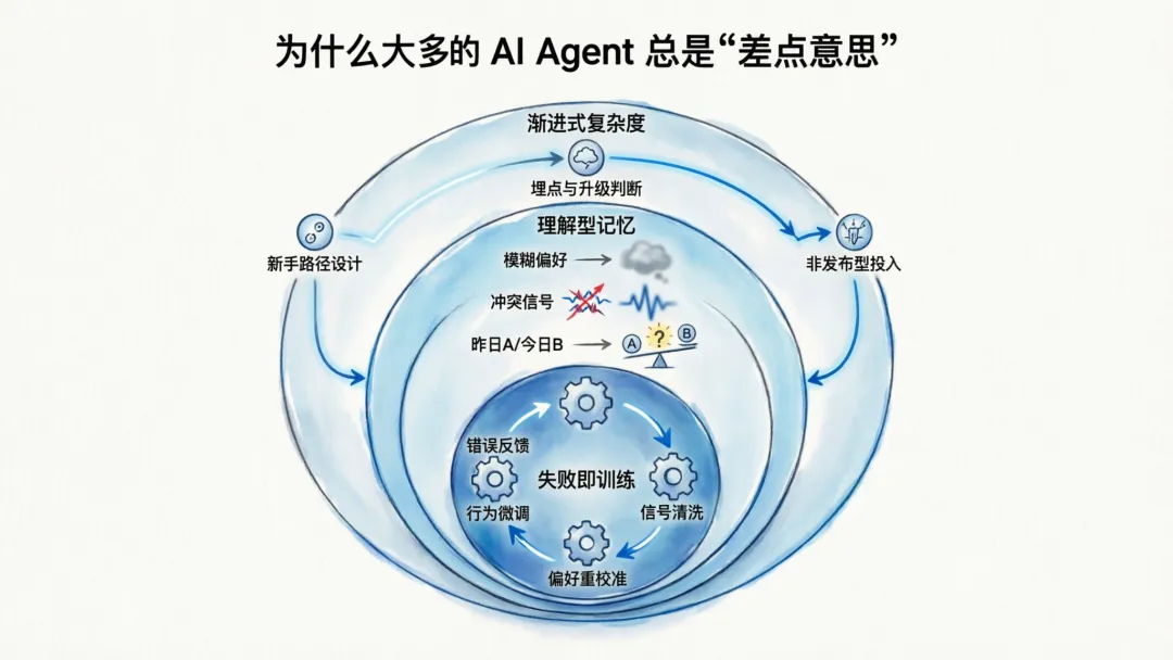 做一个"失败即训练"的 Agent,意味着你要接受产品永远不完美——它一直在变,一直在调整,永远没有一个"最终版本"。