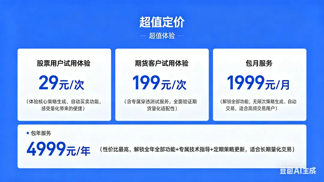 我们不玩套路、不藏猫腻,就是要让普通散户,用亲民价格,享受机构级的量化体验,定价透明,按需选择: