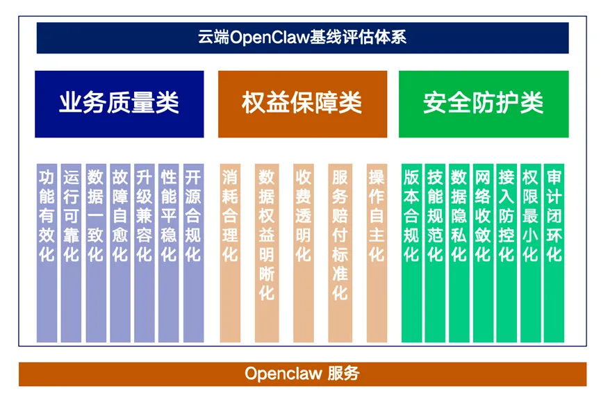 云端 OpenClaw 基线体系以三大类量化指标为核心,通过标准化测试流程与场景化验证,全面保障平台业务稳定、权益合规与安全可控。