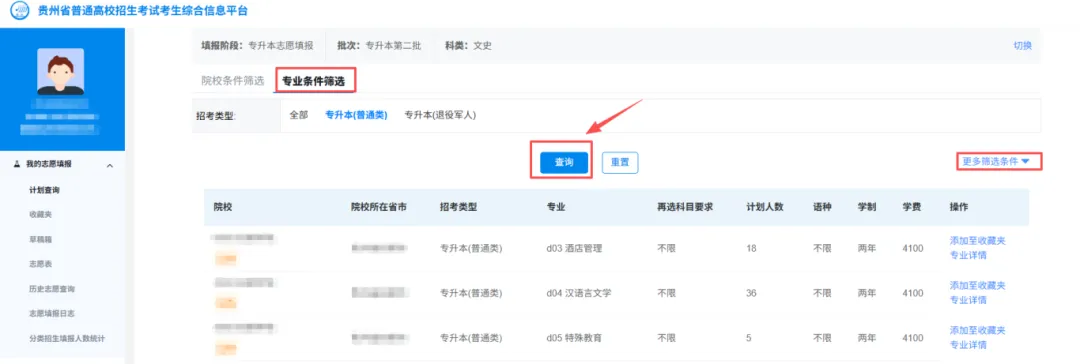 通过【院校条件筛选】和【专业条件筛选】筛选院校专业信息。不同考试类型的考生只能查询到对应招考类型下的招生计划。