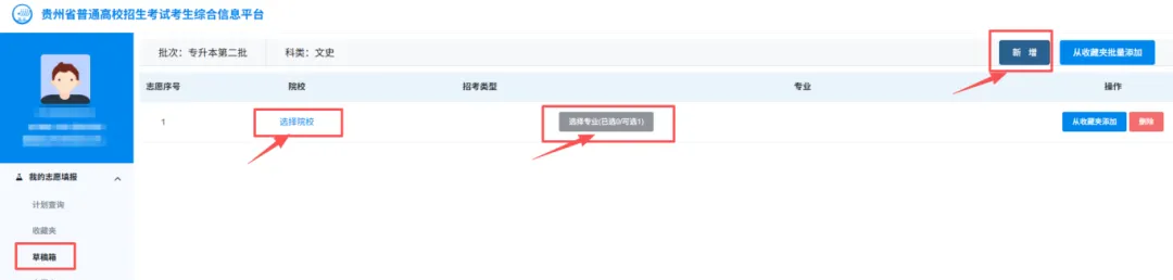 方式2:通过【新增】添加志愿草稿。考生可通过左侧的【我的志愿填报】→【草稿箱】→【编辑】→【新增】添加志愿草稿。