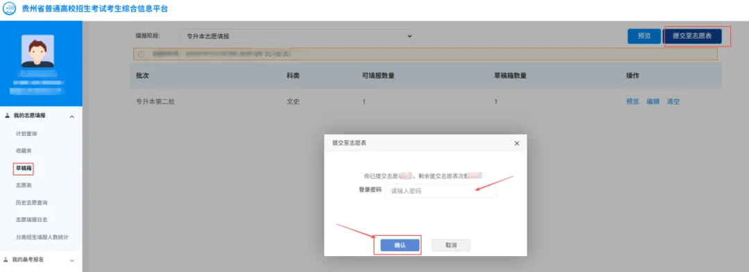 考生确认所填写志愿草稿准确无误后,须点击【草稿箱】→【提交至志愿表】,输入登录密码进行确认、确保提交成功后,志愿方可生效。