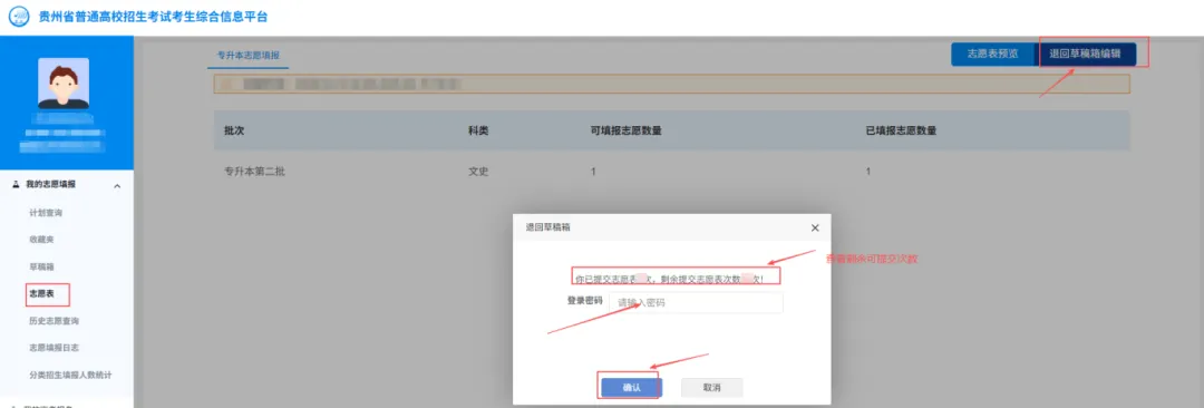 考生如需修改已提交志愿,可通过【志愿表】→【退回草稿箱编辑】,将已提交志愿退回至草稿箱,此时系统会提示已提交志愿表次数和剩余可提交次数,输入登录密码后确认退回。