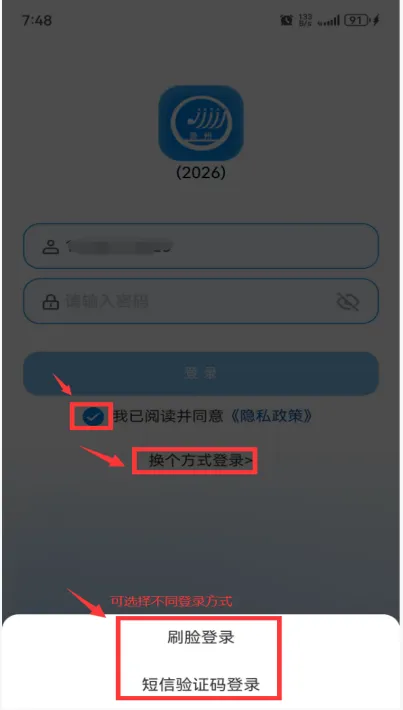 考生在手机上打开【贵州招考】APP,输入本人考生号或证件号或手机号,选择【我已阅读并同意《隐私政策》】,系统默认登录方式为【密码登录】,考生可点击下方【换个方式登录】,选择【短信验证码登录】或【刷脸登录】。