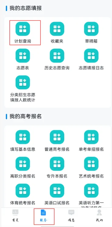 选择【服务】→【我的志愿填报】→【计划查询】,查询可填报的院校专业计划。