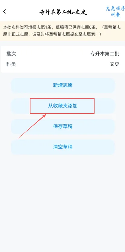 方式1:通过【服务】→【我的志愿填报】→【草稿箱】进入草稿箱页面,在页面上点击【可填/草稿箱】,选择【从收藏夹添加】。