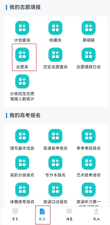 方式2:通过【服务】→【我的志愿填报】→【草稿箱】进入草稿箱页面,在页面上点击【可填/草稿箱】,选择【新增志愿】。