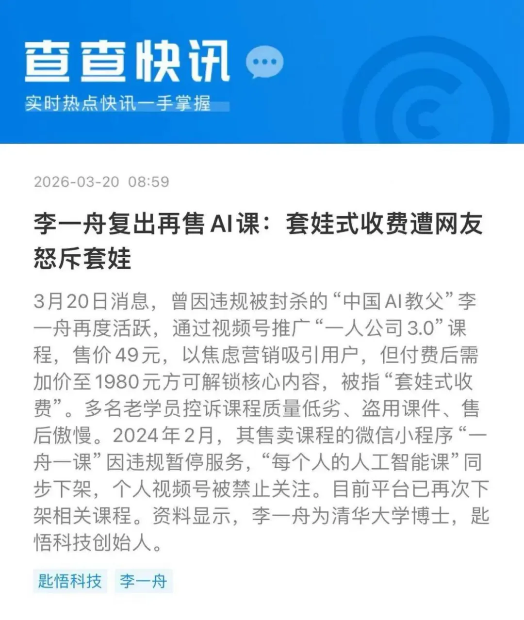 比如曾经因为卖AI课被封杀的李一舟,换个平台又开始卖AI一人公司的课程。
