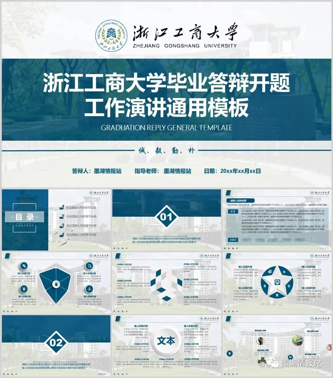 “浙江工商大学”PPT模板来了~我们为大家带来了新一期浙江工商大学PPT模板本次为第3次更新新制作PPT质量较高其中内含:logo抠图25套浙商大PPT模板常用的100多套PPT模板(已经按照PPT风格进行分类) 还有20套大学通用PPT『每一套PPT都有相对应的预览图哦让你快速找到自己喜欢的PPT模板』一共有145套模板大学期间的PPT都不用发愁啦都是免费供大家领取哦免费!免费!获取方式:扫码关注【墨湖情报站】后台回复: 浙商大上图上图▼篇幅有限,以上仅部分展示 资源获取方式 长按下方二维码回复: 浙商大