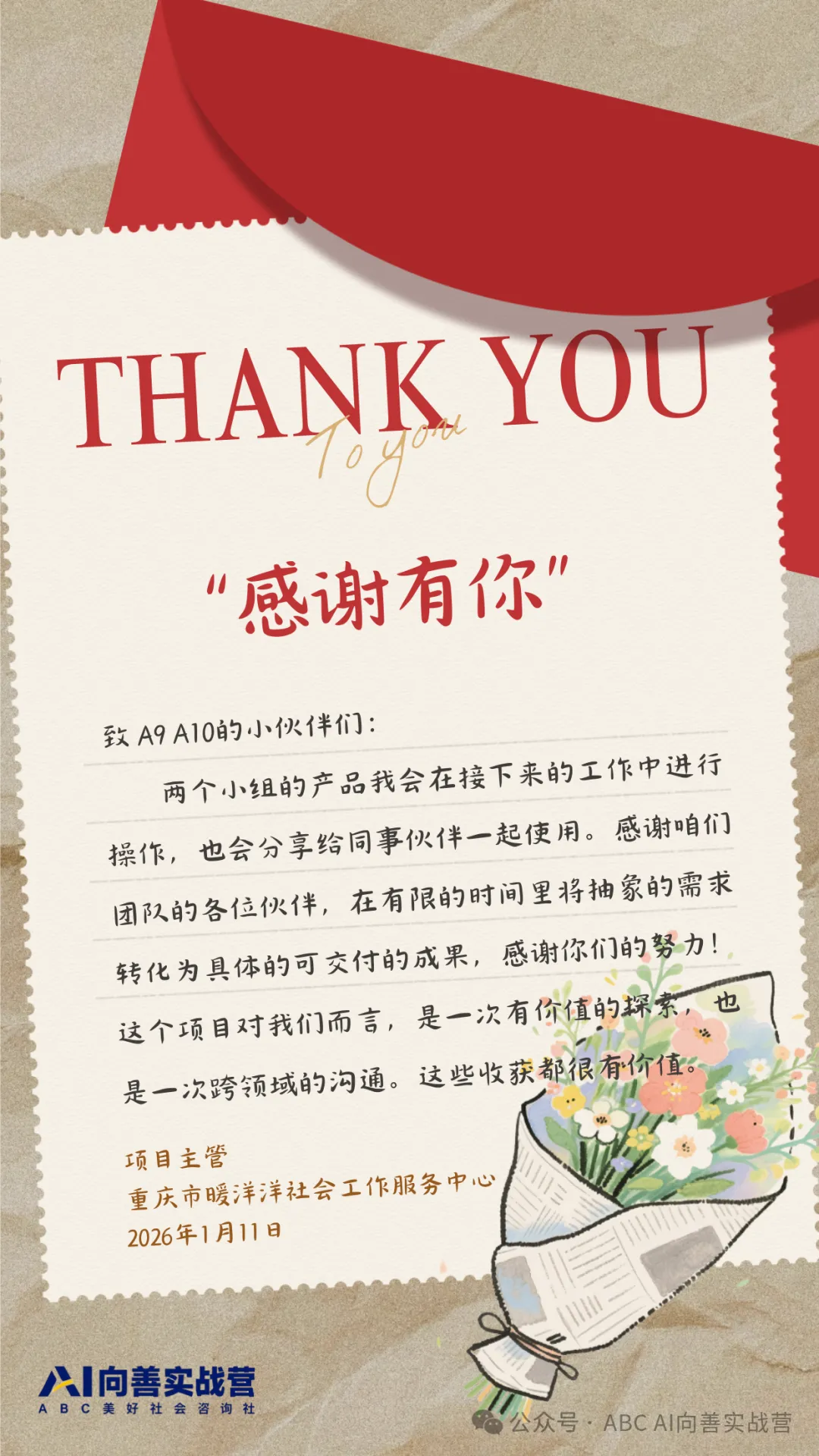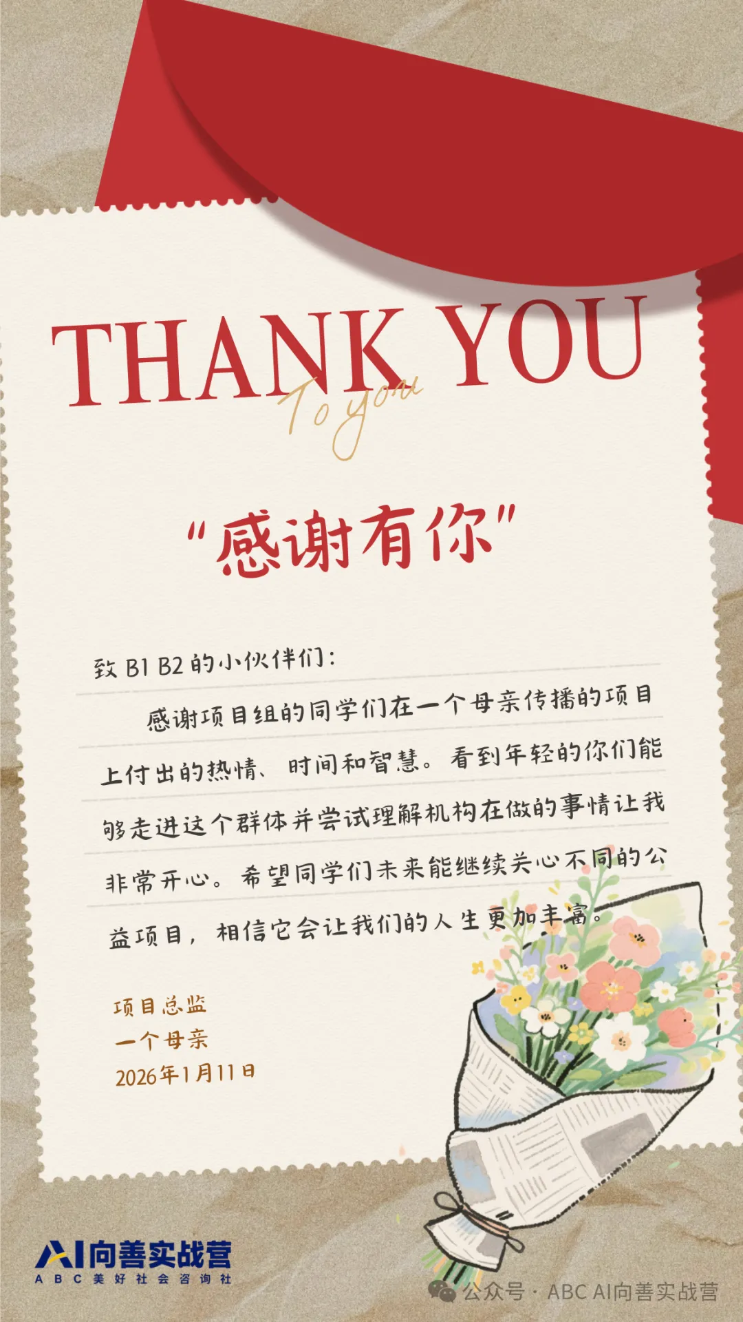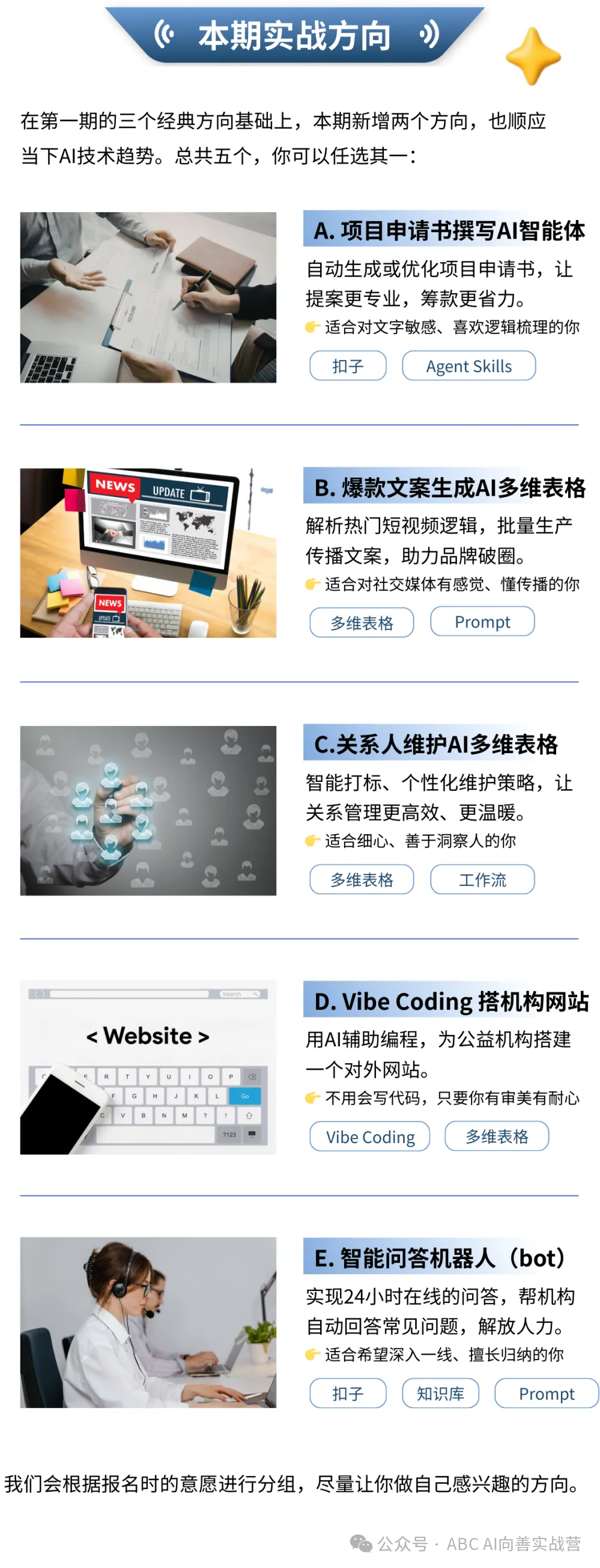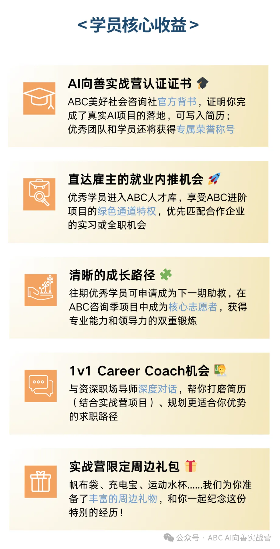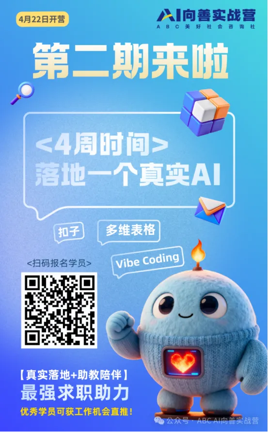 你是否对AI有热情,你是否想“用技术做真实有用之事”,你是否还在焦虑中观望,不如像首期学员那样,亲手用AI为公益解一题,让成长被看见、简历有内容、面试有故事。真实项目的机会从不嫌多,这次,刚好轮到你行动。