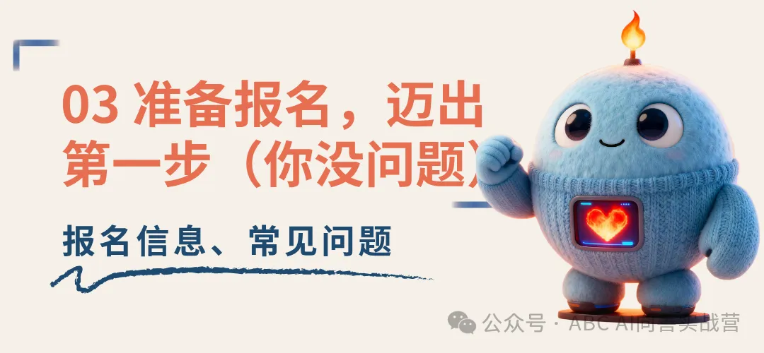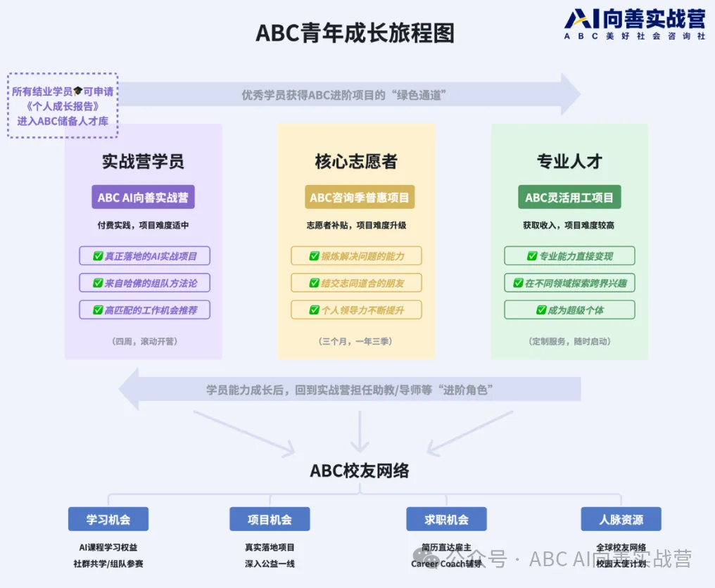 *报名费用包含四周营队期间的全部培训内容、涉及的所有AI工具付费额度、导师/助教辅导、项目证书,和加入ABC全球校友网络的机会。