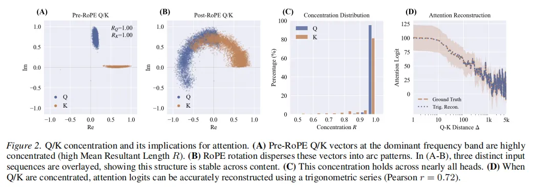 研究团队观察到,在绝大多数注意力头中,Pre-RoPE 的 Q/K 向量并不是分散无序的,而是围绕固定的非零中心高度聚集。研究团队用平均合向量长度(Mean Resultant Length, MRL) 来衡量这种集中性,
