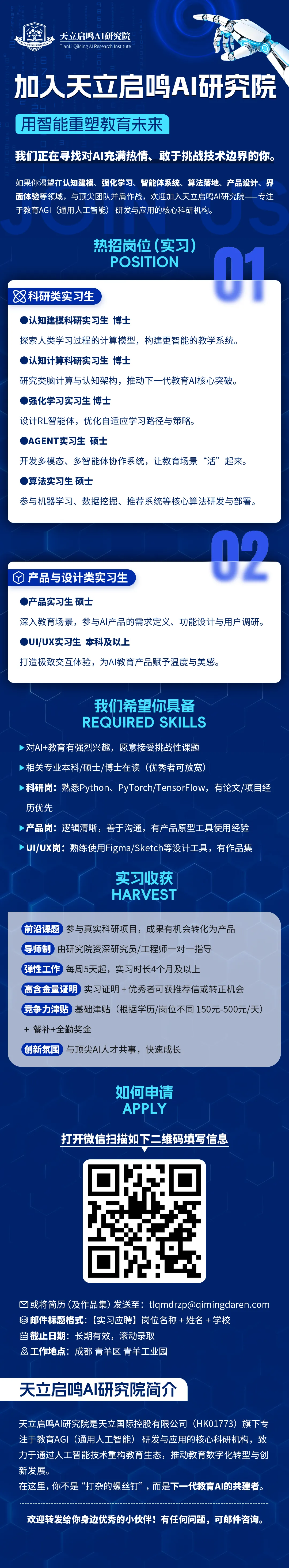 招聘 | 天立启鸣AI研究院实习生招募,科研/产品/设计岗位开放!