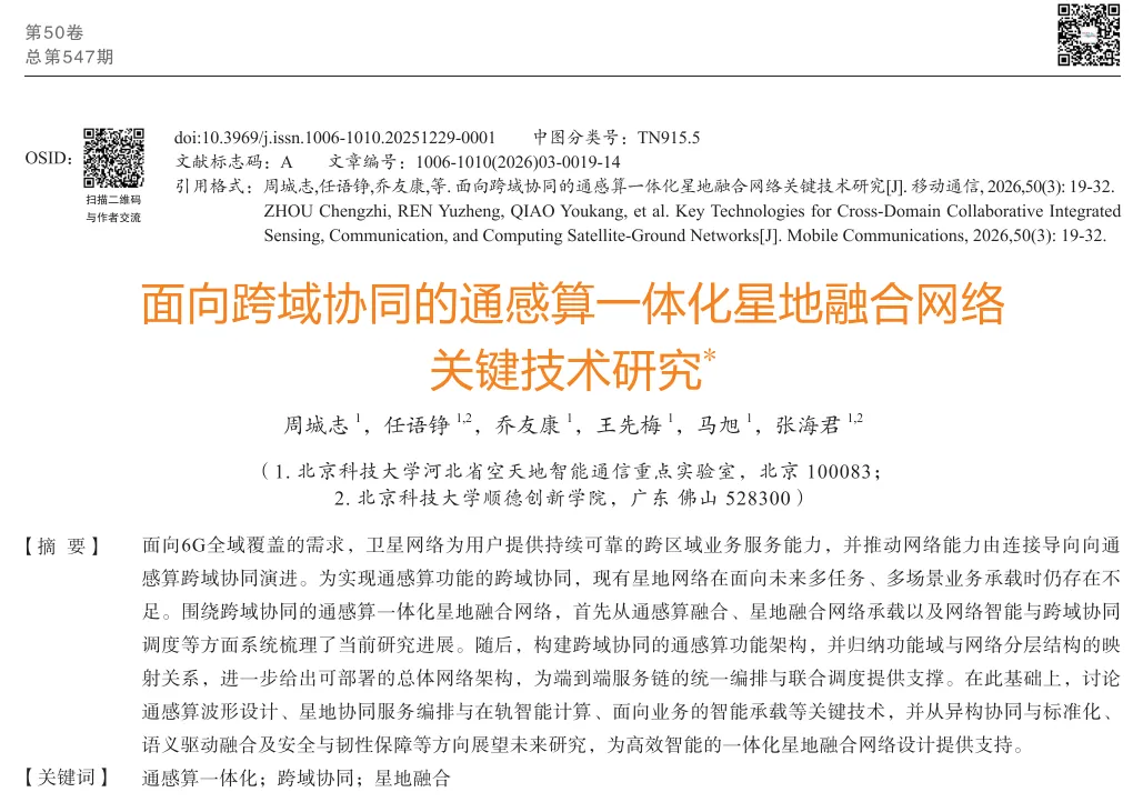 面向跨域协同的通感算一体化星地融合网络关键技术研究