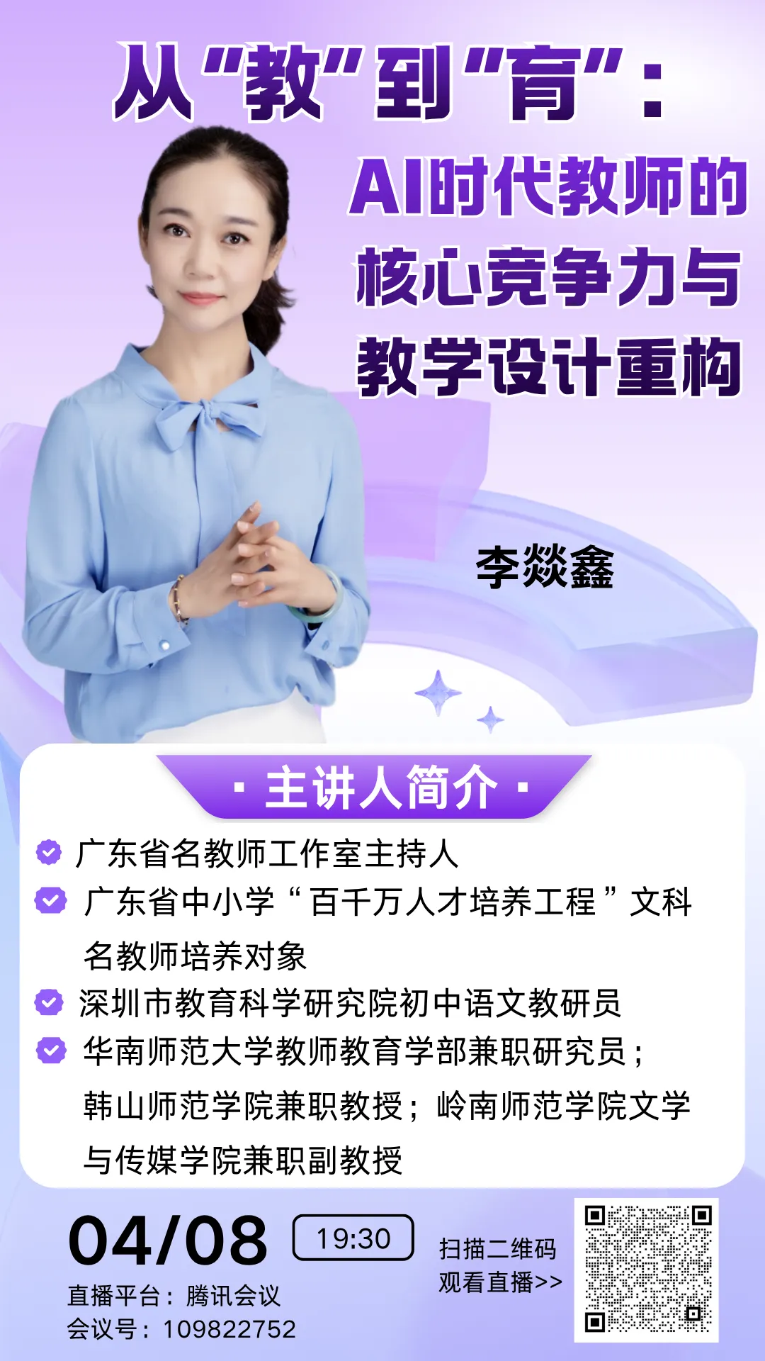 叶乃培老师:聆听广东省李燚鑫名师工作室《从“教”到“育”:AI时代教师的核心竞争力与教学设计重构》专题分享,我深受触动。AI正重塑教育生态,一线教师既要主动拥抱技术,用AI重构教学设计、赋能学情分析,更要坚守育人初心,以情感与价值引领补足技术短板。未来我将在人机协同中深耕课堂,实现从“教”到“育”的转型,让课堂兼具科技精度与人文温度。