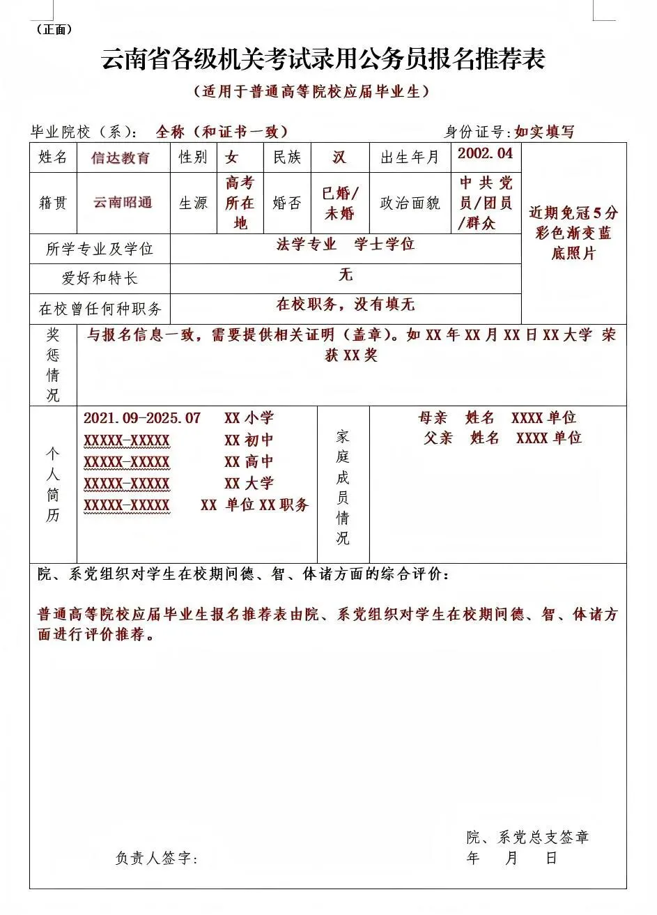 3.报名推荐表。所在学校或者单位盖章的报名推荐表原件(报考选调生职位的携带选调生报名推荐表原件)。