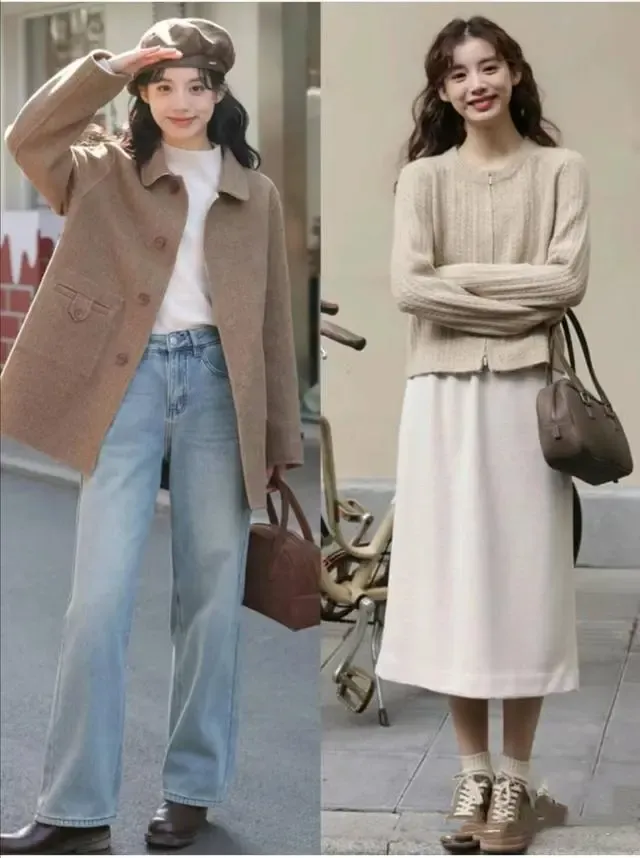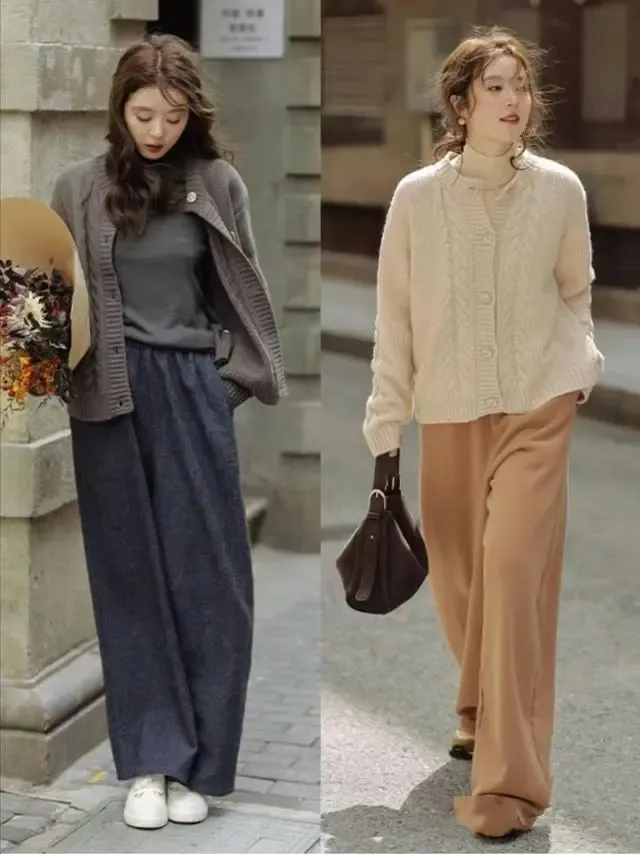 温暖的颜色,给人一种优雅的感觉,给人一种优雅的感觉。象这样的针织开衫,或者是打底衫,或者是阔腿裤,我们可以选用较为柔软的颜色。