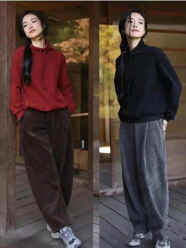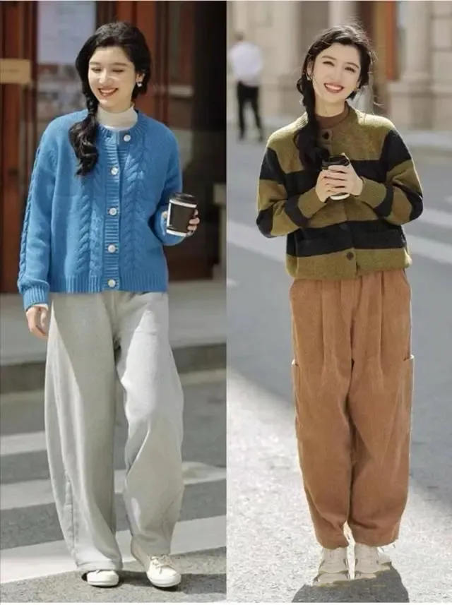像是羊毛的毛衣,棉麻的裤子,都是比较舒服的。棉质的灯笼裤,看起来很有年代感,再加上一件毛衣,看起来就很温柔精致。