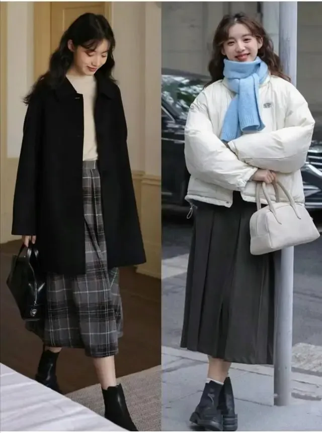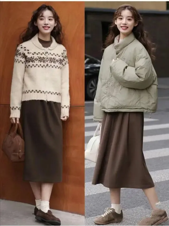 冬季羊绒绒的半身长裙,我们可以搭配比较稳重的颜色。棕色的,棕色的,棕色的,焦糖色的,黑色的,都很好看。复古的毛衣和羊毛短裙,看起来都很高挑。