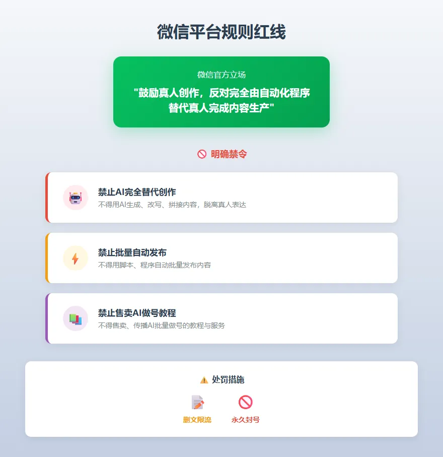 早在3月27日,《微信公众平台运营规范》就已新增"非真人自动化创作行为"的规定。只是这次事件让这条红线彻底浮出水面,给所有想靠AI"躺赚"的人敲响了警钟。