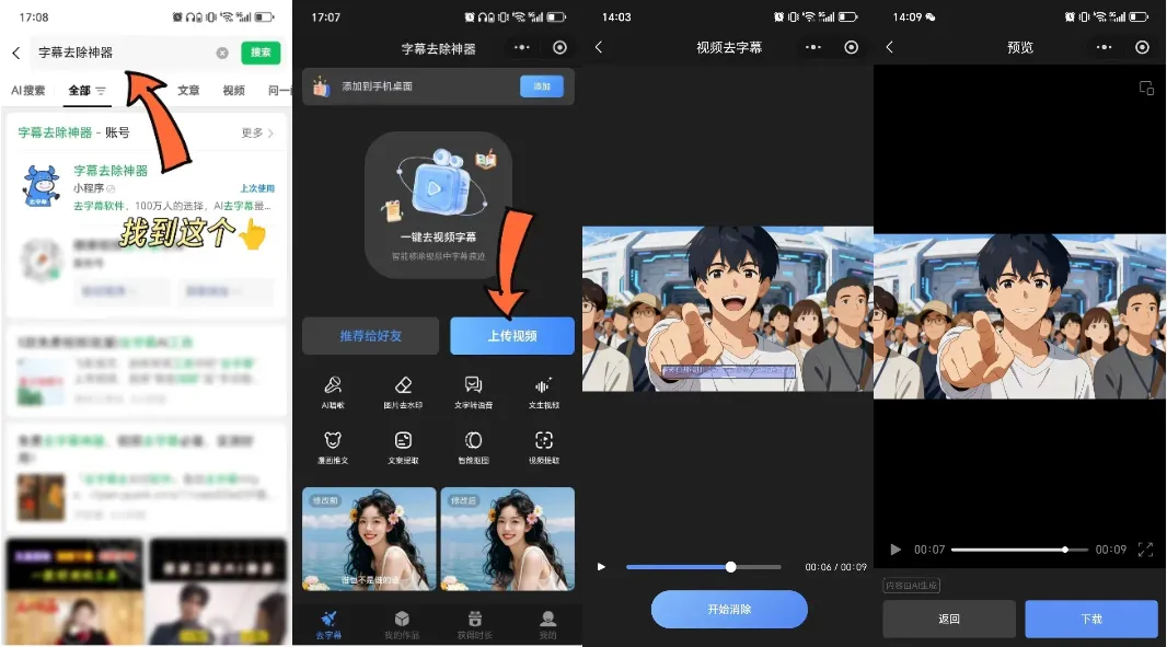 三步操作:微信搜索进入→上传视频→框选字幕 / 水印→一键消除保存