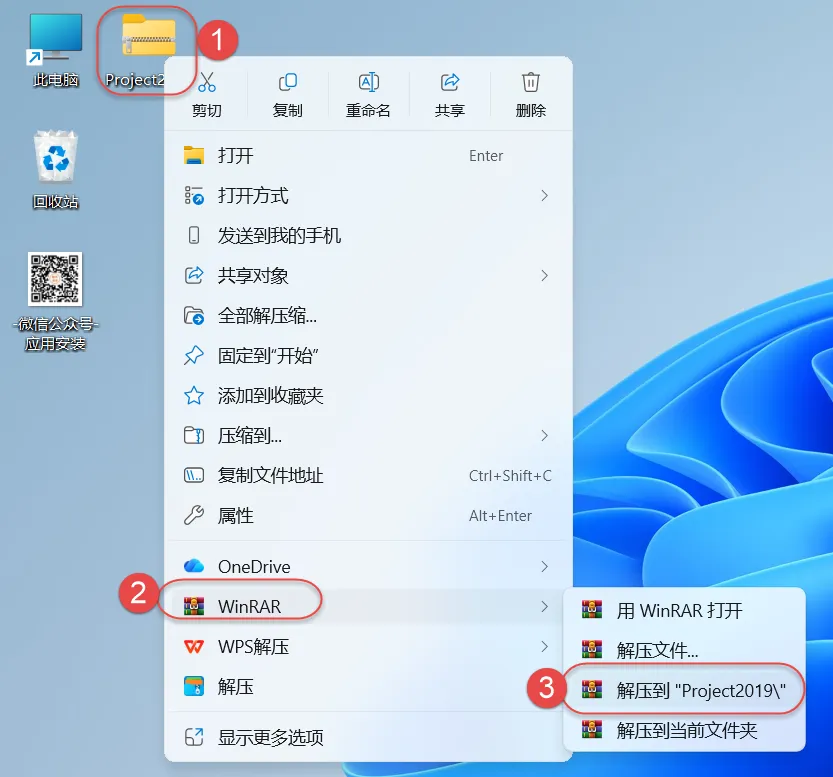 1.鼠标右击"Project2019"压缩包选择"解压到Project2019"。
